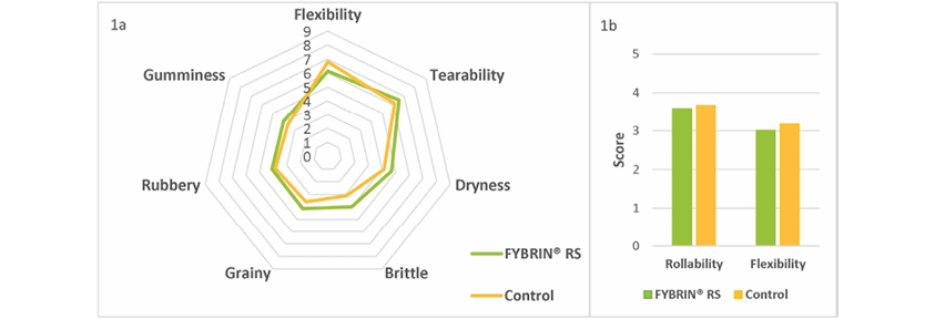 Fig 1 compares the texture of corn tortillas after 14 days of storage, with & without 4.68% FYBRIN® RS. Fig 1a shows a spider plot from a trained sensory panel's evaluation, while Fig 1b presents empirical ratings for rollability and flexibility.