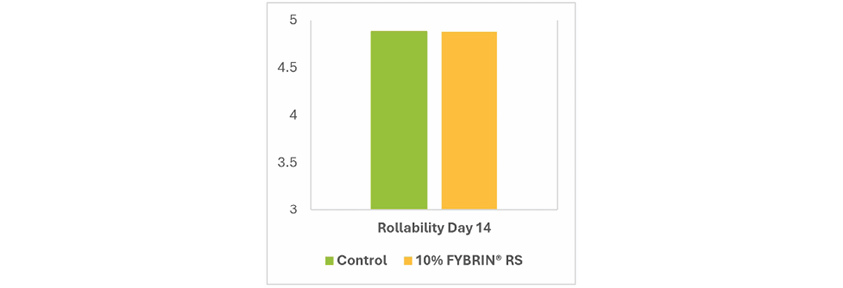 When comparing the texture of the tortillas, there were no significant differences in texture after 14 days of storage as rated by a trained sensory panel (Figure 1a) or using empirical rollability and flexibility measurements (Figure 1b). These texture results demonstrate the ease of formulating with FYBRIN® RS, as fiber can be incorporated in a product with minimal formula changes.