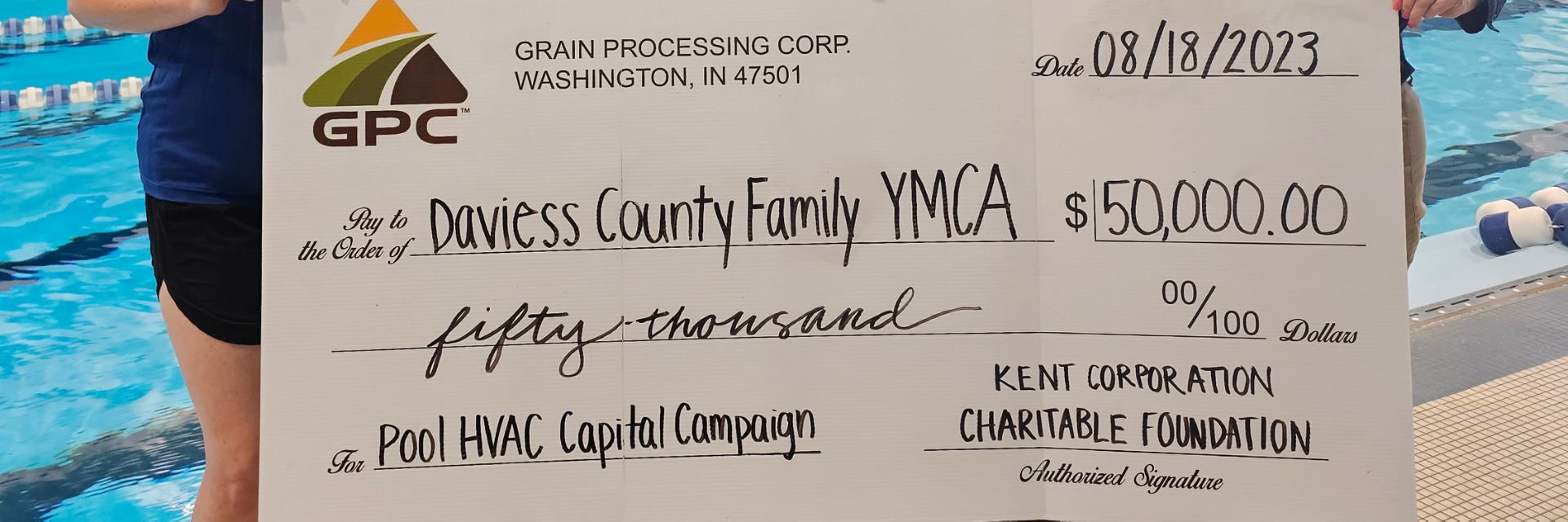 Washington, IN (Aug 21, 2023) — Children and adults in Daviess County will benefit from a $50,000 contribution from the KENT Charitable Foundation. Grain Processing Corporation (GPC) is a subsidiary of the family-owned KENT Corporation and has a strong affiliation with the Daviess County YMCA. The Daviess County YMCA’s Improve, Invest, Impact pool remediation project will serve over 1,800 community members a month in Washington, Indiana.